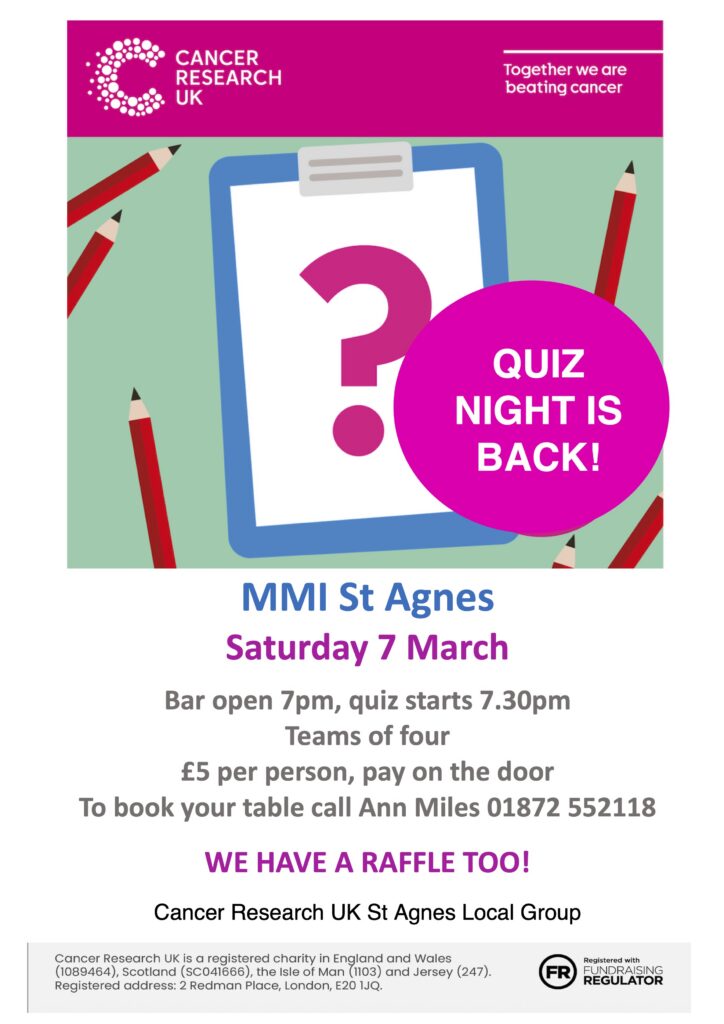 Cancer Research UK St Agnes Fundraising Committee are bringing their brilliant Quiz Night back to the MMI on Saturday 7th March!