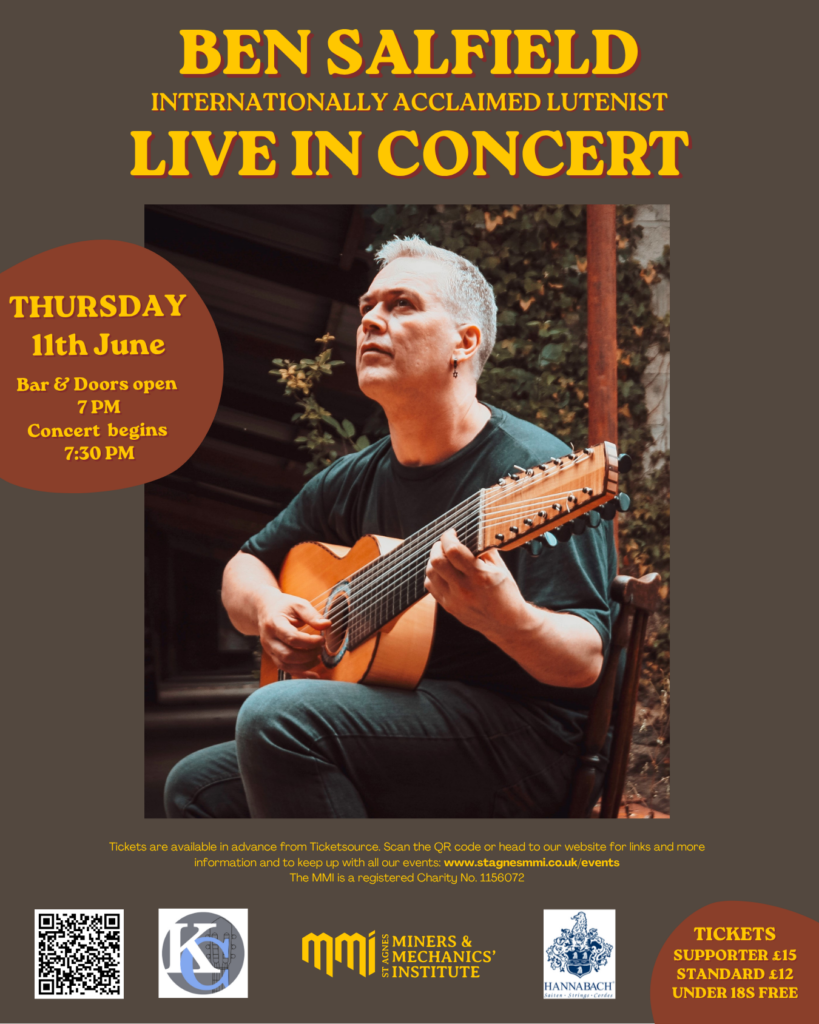 Hailed as “one of the world's greatest solo performers of renaissance lute music”, English lutenist Ben Salfield has lived in Cornwall since childhood. His work has taken him across Europe touring and playing at renowned music festivals and we are very lucky to have him playing a benefit concert here at the MMI!